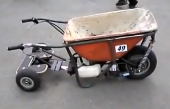 (they seem hard to find; to get the right dimensions, I had to make one). The "Go" switch is a momentary button connected to a starter solenoid. The 10 inch driven pulley turns a jack shaft with the starters' bendix attached to the drive sprocket, so the wheelbarrow can be pushed forward without disengaging the belt, but that makes it tricky going downhill with a load because nothing's holding it back, so the left hand controls a hand brake to the motorcycle wheel. If the grounds muddy, the tire will skid, so use a knobby instead of one like mine. Two Jack shafts drive a chain & sprocket that turns the wheel. The fender hump in the middle isn't a problem and the big wheel will push 250 pounds over soft ground,